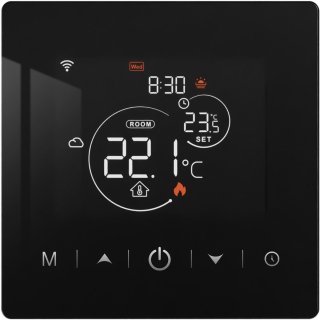 Beheer je centrale verwarming slim, eenvoudig en stijlvol met de WiFi Opbouw Thermostaat van Smartlife Domotica. Deze compacte, zwarte thermostaat met helder touchscreen combineert strak design met praktische functies: intuïtieve bediening op het apparaat, volledige afstandsbediening via je telefoon en slimme koppelingen met populaire spraakassistenten en domotica-platforms.